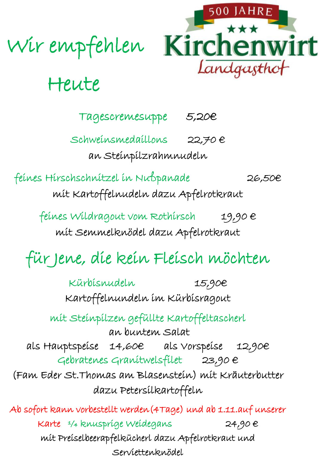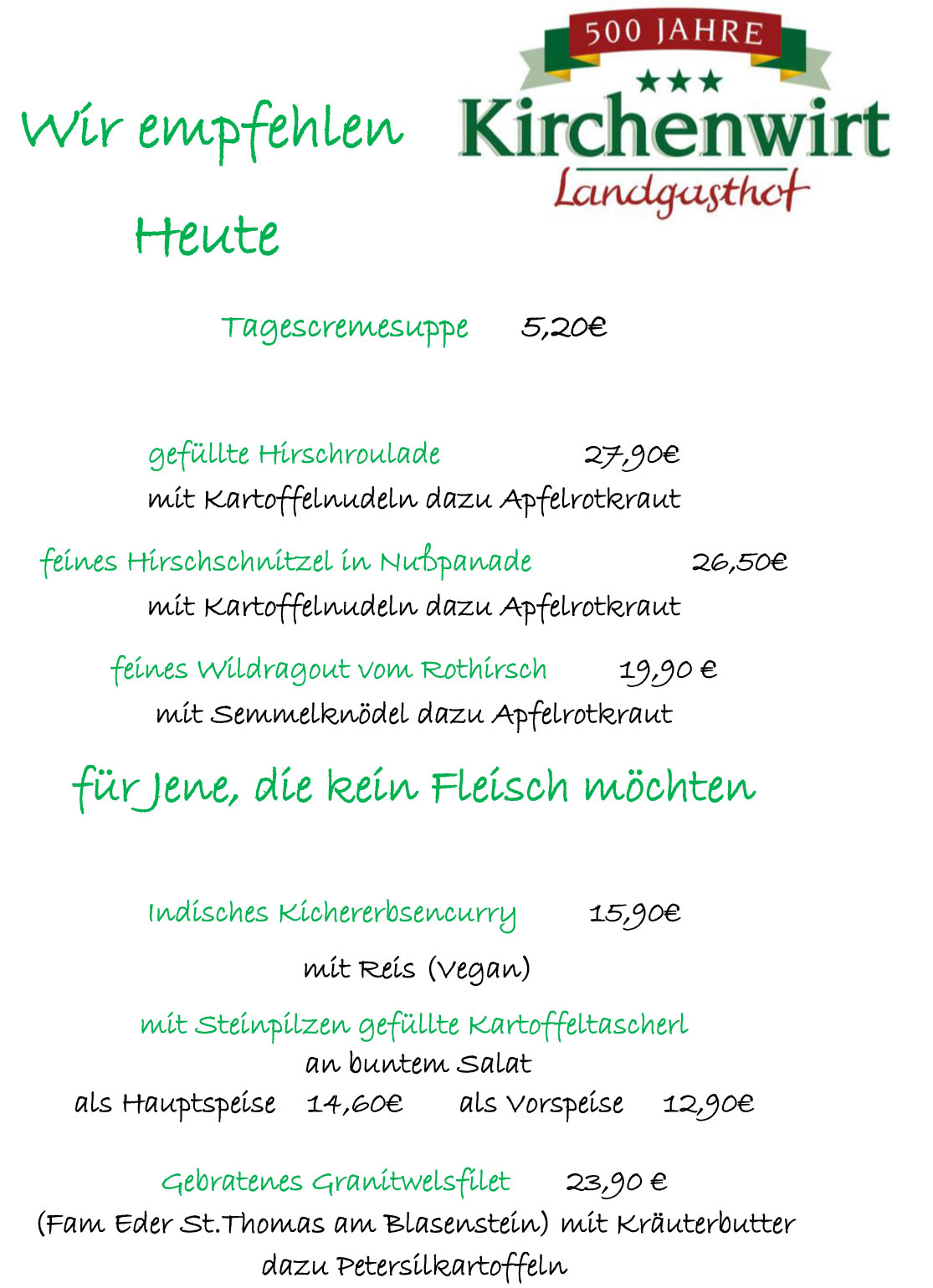Aktuell Empfehlungen der Woche 28. Januar 2025 Die Küche empfiehlt diese Woche …..Guten Appetit! Unsere Empfehlungen der Woche